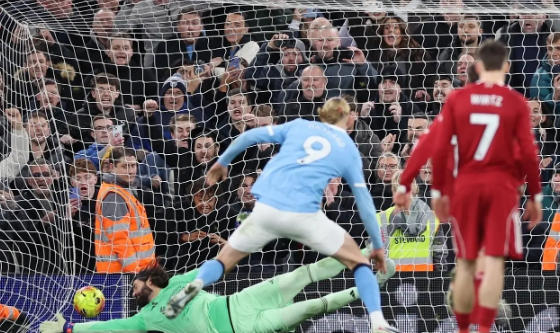 但英超聯賽向來都充滿了懸念和驚喜,它可不會讓比賽就這么平淡地結束。比賽進行到第93分鐘,場上再次發生了戲劇性的變化。阿利松出擊時絆倒了曼城的努內斯,主裁判果斷判罰點球。哈蘭德站在了點球點前,這位挪威鋒霸可是出了名的“點球專家”,他的點球技術十分精湛,很少有失手的時候。